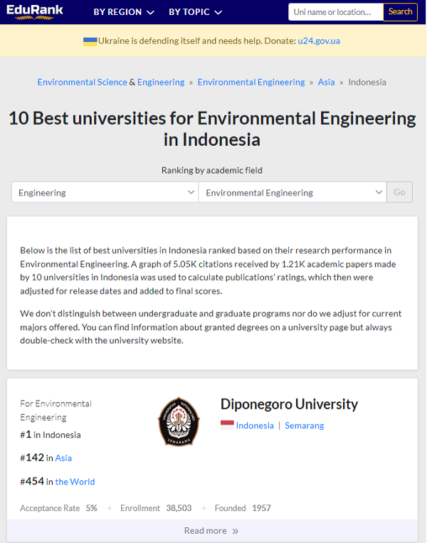 Semarang (10/1) – Departemen Teknik Lingkungan Universitas Diponegoro. Teknik Lingkungan dibawah naungan Fakultas Teknik Universitas Diponegoro berhasil meraih prestasi yang membanggakan, bahwasannya Teknik Lingkungan Universitas Diponegoro mendapat peringkat pertama jurusan Teknik Lingkungan se-Indonesia versi EduRank (https://edurank.org/engineering/environmental/id/). Pemeringkatan versi EduRank dinilai berdasarkan kinerja penelitian berupa publikasi yang diterima sebanyak 1,21 ribu makalah akademik dibidang Teknik Lingkungan yang dibuat oleh 10 universitas di Indonesia. Kemudian disesuaikan dengan tanggal rilis dan ditambahkan pada nilai akhir.
