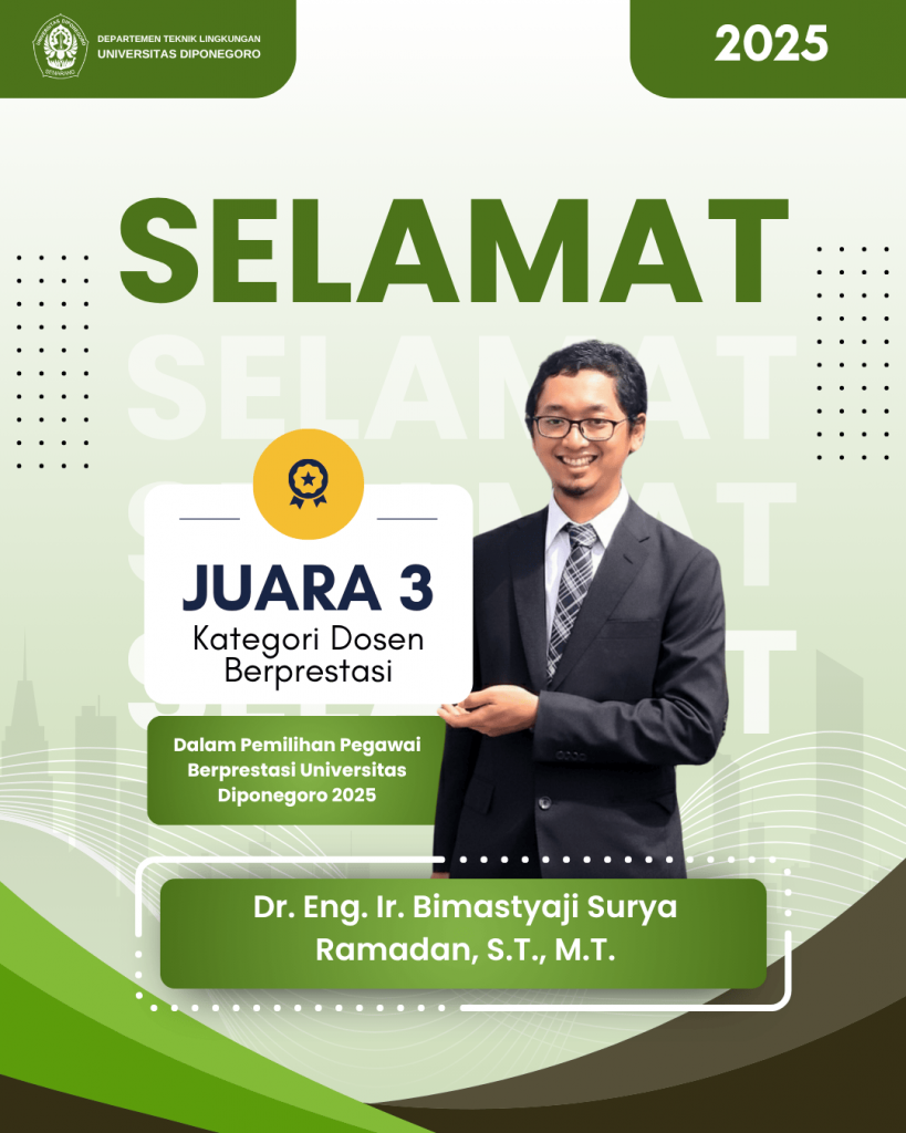 Semarang, 10 Oktober 2025 – Departemen Teknik Lingkungan dengan bangga mengucapkan selamat kepada Dr. Eng. Ir. Bimastyaji Surya Ramadan, S.T., M.T., atas prestasinya meraih Juara 3 Dosen Berprestasi dalam ajang Pemilihan Pegawai Berprestasi Universitas Diponegoro 2025.