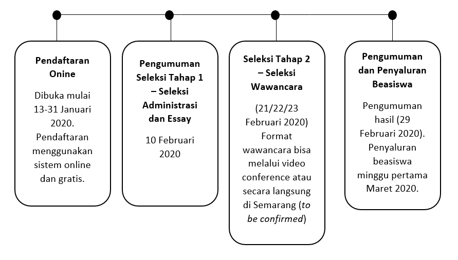 Scholarships will be awarded to the four selected students, each of which will receive a total of Rp. 6,000,000.00 for two semesters and will be paid per month (Rp. 500,000.00/month)