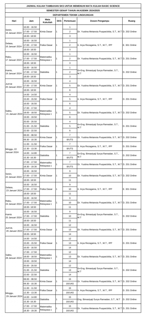 Menindaklanjuti hasil visitasi lapangan akreditasi IABEE di Departemen Teknik Lingkungan Undip pada tanggal 6-8 November 2023, yang menyatakan bahwa perlu adanya tambahan sks untuk memenuhi mata kuliah basic science, maka bagi mahasiswa tersebut perlu mengikuti perkuliahan berikut.