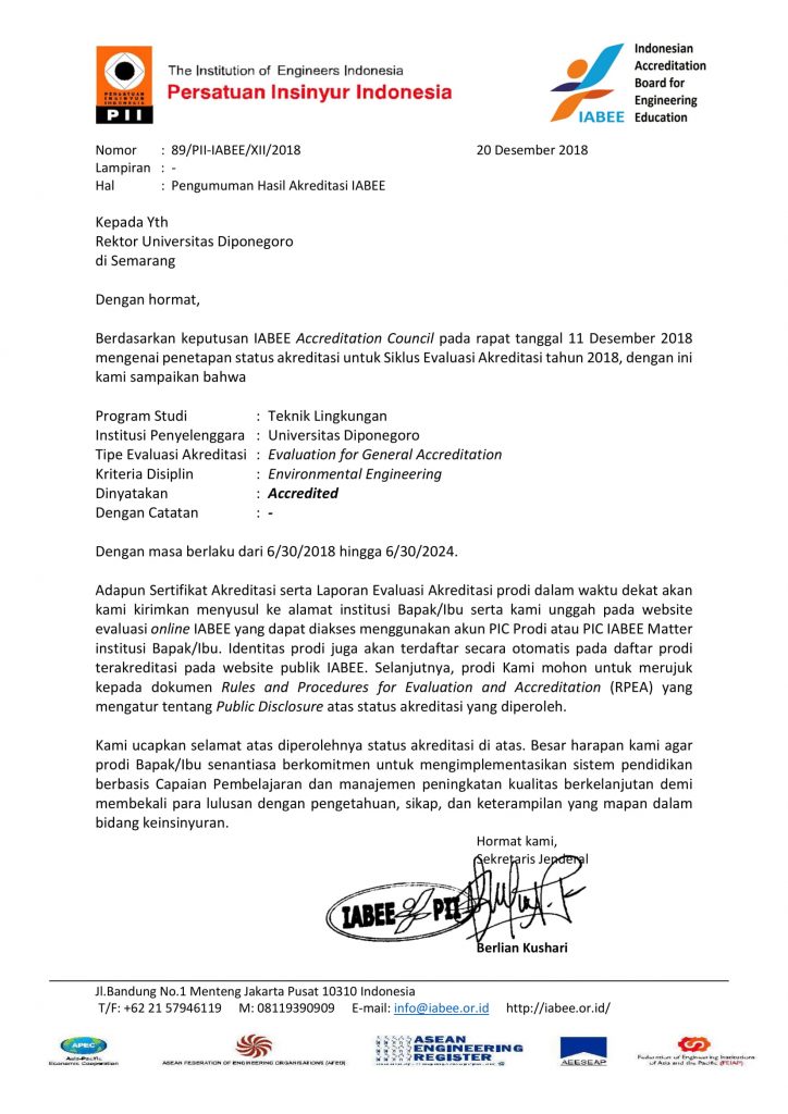 Berdasarkan keputusan Indonesian Accreditation Board for Engineering Education (IABEE) Council, pada rapat yang dilaksanakan tanggal 11 Desember 2018 telah ditetapkan status akreditasi untuk Departemen Teknik Lingungan, Universitas Diponegoro, yaitu accredited.
